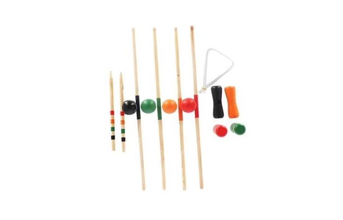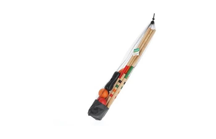 Croquet is een leuk buitenspel om te spelen met vrienden of het gezin. Plaats de poortjes in het gras of in het zand en probeer zo snel mogelijk je eigen bal door de poortjes en weer terug te slaan. De Outdoor Croquet set van Alert bevat 4 houten stokken van 75 cm groot met elk een eigen kleur. De stokken hebben ballen met bijpassende kleuren. Geschikt voor kinderen vanaf 3 jaar en ouder.