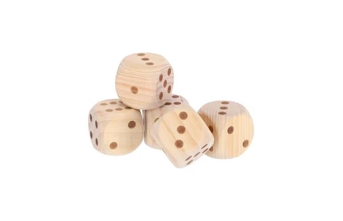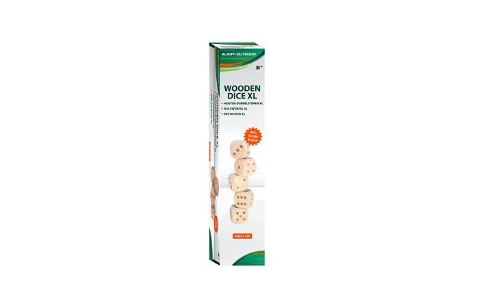 Dobbelstenen XL Hout Alert Met Scoreblok. Vijf houten dobbelstenen van 6cm groot voor gebruik buitenshuis. Inclusief scoreblok. Geschikt voor kinderen vanaf 5 jaar.