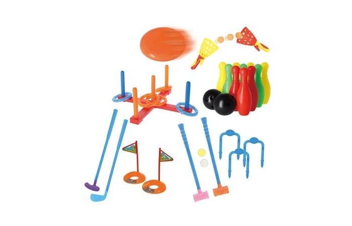 Sportset 6 in 1. Dit is een sportset met de mogelijkheid om 6 verschillende sporten te spelen. Inhoud: Frisbee Vangbalspel Ringen gooien Bowlen Golf Croquet.