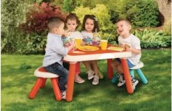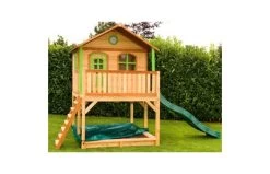 ruimte voor een zandbak en een snack- / activiteitenplank waar kinderen tegelijkertijd kunnen spelen en genieten van een drankje. Een standaardladder en stevige rotswand maken klimmen gemakkelijk of