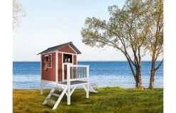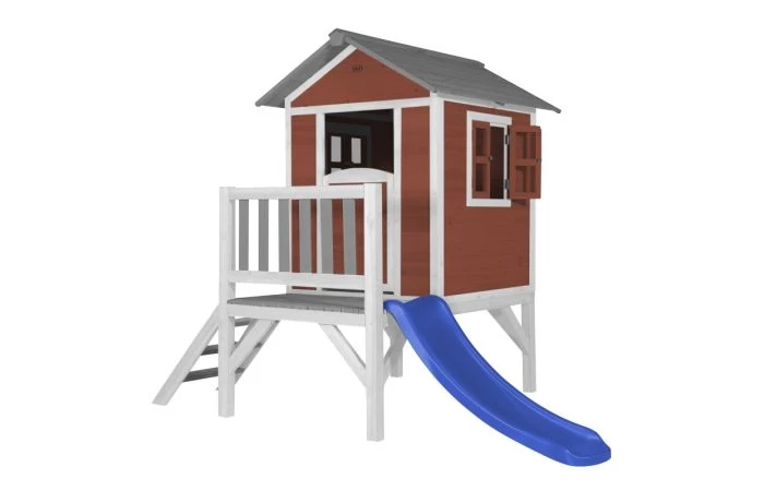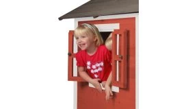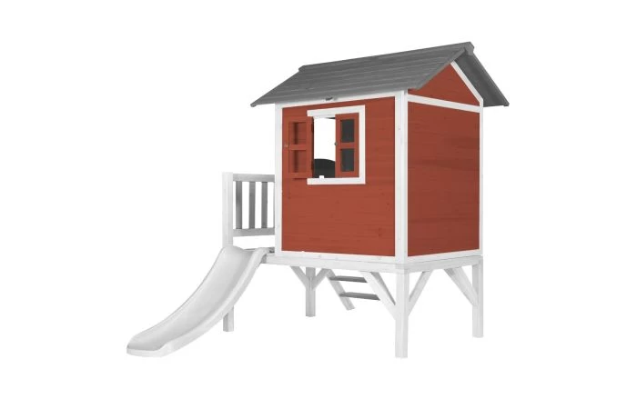 Klimmen op de trap, over de veranda en snel weer naar beneden van de glijbaan? Dat kan met het Lodge XL Speelhuis Scandinavisch Rood van AXI. Hoe vaker ze naar beneden glijden, hoe leuker ze het vinden! Lodge XL Speelhuis is een leuk basis huisje welke in iedere tuin past. Het speelhuisje uit de Beach serie van AXI is uitgevoerd in Scandinavische rood/grijze kleuren welke perfect in iedere hedendaagse tuin passen. Lodge XL speelhuis heeft een platformhoogte van 57 cm en is uitgevoerd met een kleine glijbaan van 118 cm lang. Aan de zijkanten heeft het ramen die eenvoudig geopend kunnen worden. De stoere halve deur heeft een brievenbus waar kinderen post doorheen kunnen gooien als ze postbodetje spelen. Het trapje en glijbaan kunnen zowel links als rechts aan het speelhuis worden bevestigd.
