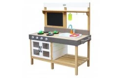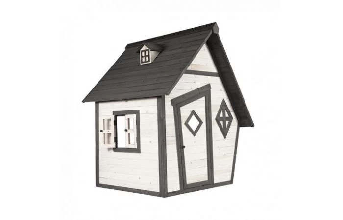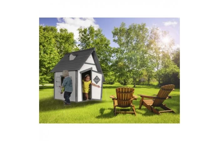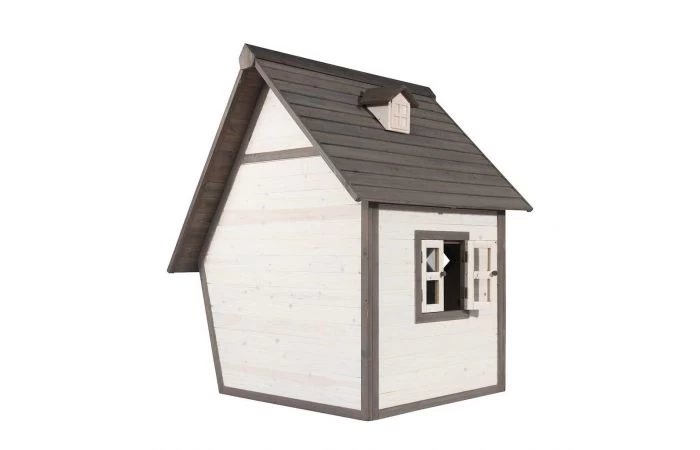 Dit karakteristieke houten speelhuisje, de Cabin, van Sunny geeft je de waan alsof je op het strand staat. De wit/grijze kleurstelling heeft een stoere uitstraling en door het halfopen deurtje kun je goed naar buiten kijken.