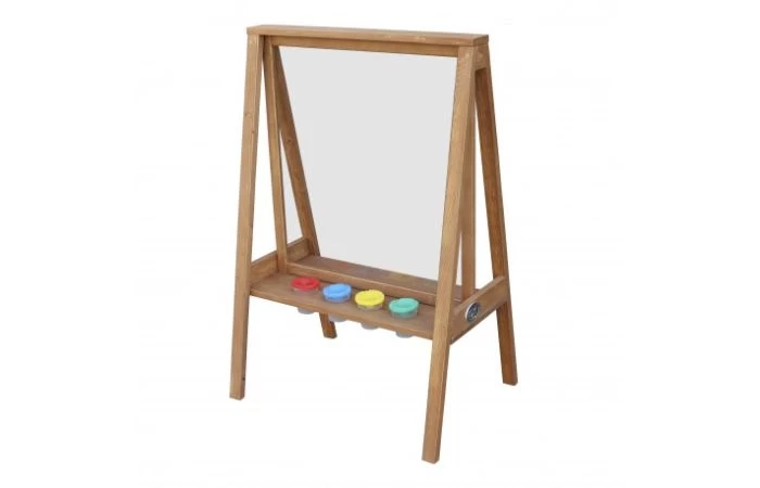 De schildersezel wordt geleverd met een handig canvas van plexiglas. Plexiglas is eenvoudig om schoon te maken. Zo kan je kind bij de volgende schildersessie direct weer aan de slag gaan! De verf kan in de vier gekleurde bakjes – groen, rood, blauw en geel – gegoten worden. Dat ziet er niet alleen leuk uit, maar verkleint ook de kans op het omstoten van potjes verf. Zo blijft alles netjes terwijl je kinderen hun eigen meesterwerk creëren! Aan de andere zijde van de ezel is voldoende ruimte om ander tekengerei neer te leggen, zodat er aan twee kanten tegelijk gespeeld kan worden.