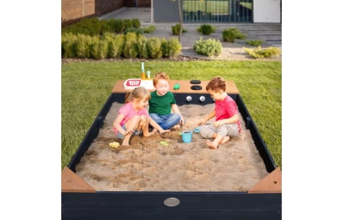 De zandbak is gemaakt van FSC 100% hemlock hout en is daarnaast afkomstig van duurzaam beheerde bossen en daarom ook een milieubewuste keuze. Deze houtsoort splintert niet en is van nature bestand tegen weersinvloeden zoals regen en dus resistent tegen houtrot. De zandbak is ook nog eens behandeld met een watergedragen beits, zonder chemicaliën. Je hoeft de zandbak voor gebruik dus niet te behandelen.