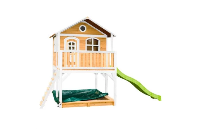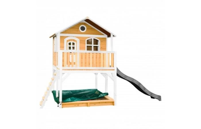 Marc Speelhuis Bruin/wit van AXI heeft echt alles wat je kinderen maar wensen kunnen! Een trap om in het huisje te klimmen en vervolgens van de lange glijbaan naar beneden te roetsjen. En dan zijn ze nog niet uitgespeeld, want onder het speelhuis is ook nog een zandbak waar ze met z’n allen zandtaartjes kunt bakken. In dit speelhuis kunnen ze elkaar de mooiste geheimen vertellen. Zodra ze de ramen en deur dicht doen, kan niemand ze meer afluisteren! Marc is een veelzijdig houten speelhuis met een halfronde deur en ramen. De deur heeft een brievenbus waar kinderen post doorheen kunnen gooien als ze postbodetje spelen. Het speelhuisje is uitgevoerd in moderne bruin/witte kleuren welke perfect in iedere hedendaagse tuin passen. Marc speelhuis heeft een platformhoogte van 118 cm en is uitgevoerd met een grote glijbaan van 228 cm lang. Het trapje en glijbaan kunnen zowel links als rechts aan het speelhuis worden bevestigd. Als de kinderen zijn uitgespeeld kan de zandbak eenvoudig worden afgedekt met de meegeleverde afdekhoes.