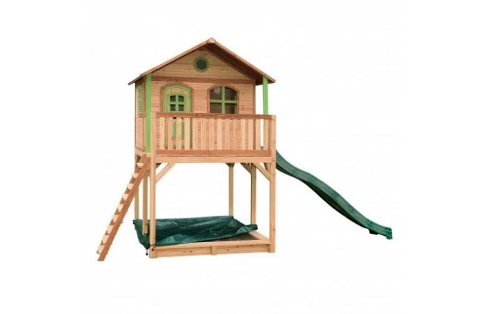 Voor de echte waaghalsjes heeft AXI nu het Andy Speelhuis Bruin/groen, een speelhuis op een platformhoogte van maar liefst 148 cm! Houden jouw kinderen van een mooi uitzicht, klimmen of glijden? Dan is Andy het speelhuis voor jouw kinderen. Ze kunnen via de trap naar boven klimmen om via de veranda hun eigen huisje in te gaan. Als boven klaar zijn kunnen ze snel via de extra lange glijbaan van 290cm naar beneden glijden. En dan zijn ze nog niet uitgespeeld, want onder het speelhuis is ook nog een zandbak waar ze met z’n allen zandkastelen kunnen maken. In dit speelhuis kunnen ze heerlijk genieten van het uitzicht en elkaar de mooiste verhalen vertellen. Zodra ze de ramen en deur dicht doen, kan niemand ze meer afluisteren! Andy is een veelzijdig houten speelhuis met een halfronde deur en ramen. De deur heeft een brievenbus waar kinderen post doorheen kunnen gooien als ze postbodetje spelen. De bruin/groene kleuren zijn herkenbaar als de klassieke AXI producten welke al jaren enorm succesvol zijn voor jong en oud. Het trapje en glijbaan van Andy speelhuis kunnen zowel links als rechts aan het speelhuis worden bevestigd. Als de kinderen zijn uitgespeeld kan de zandbak eenvoudig worden afgedekt met de meegeleverde afdekhoes.