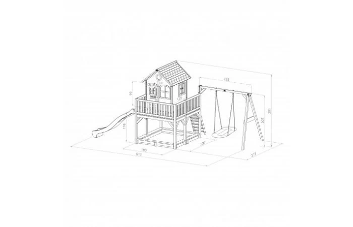 Via de trap kunnen ze omhoog klimmen om het huisje in te gaan en vervolgens van de lange glijbaan naar beneden roetsjen. En dan zijn ze nog niet uitgespeeld, want onder het speelhuis is ook nog een zandbak waar ze met z’n allen zandtaartjes kunt bakken. In dit speelhuis kunnen ze elkaar de mooiste geheimen vertellen. Zodra ze de ramen en deur dicht doen, kan niemand ze meer afluisteren! Liam is een veelzijdig houten speelhuis met een halfronde deur en ramen. De deur heeft een brievenbus waar kinderen post doorheen kunnen gooien als ze postbodetje spelen. Het speelhuisje is uitgevoerd in moderne bruin/witte kleuren welke perfect in iedere hedendaagse tuin passen. Liam speelhuis heeft een platformhoogte van 118 cm en is uitgevoerd met een grote glijbaan van 228 cm lang. Als de kinderen zijn uitgespeeld kan de zandbak eenvoudig worden afgedekt met de meegeleverde afdekhoes.