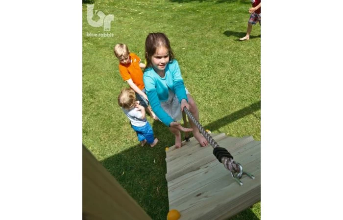 Klauter via de steile helling van de @ramp naar boven. Het dikke touw biedt een uitstekende grip aan kleine kinderhandjes. Dikkere houten balkjes zorgen voor een beetje extra voetensteun tijdens het klimmen.
