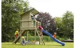 Maak in de zandbak mooie grote zandkastelen en droom dat je echt op het strand ben. Klim via de touwladder of de trap weer omhoog. Via de trap komt je op het balkon en via de touwladder kom je in het huisje terecht. Regent het? Pak de touwladder dan ben je zo boven en zit je heerlijk onder het waterdichte dak.