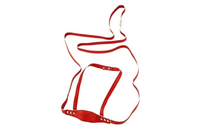 Doe het korte gedeelte om de nekĀ zodat het leren plaatje op de borst zit, het lengte gedeelte van het tuigje op de rug.