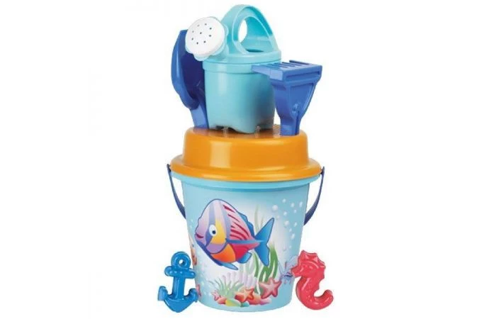Deze 7–delige speelgoed emmerset is uitgevoerd in leuk Crazy Fish design. De setbestaat uit een emmer met hengsel en heeft een doorsnede van 17 cm. Tevens wordt de set geleverd met leuke accessoires; een gieter met sproeikop, een harkje, eenschepje, 2 zandvormpjes en een zeef.Â