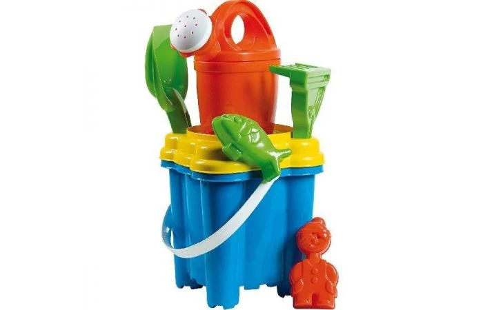 Emmerset kasteel, 16 cm hoog, 7–delig. Set bestaat uit 1 schep, 1 harkje, 1 gieter, 2 zandvormpjes, 1 zeef en 1 emmer..Set is verpakt in een net.                        Â