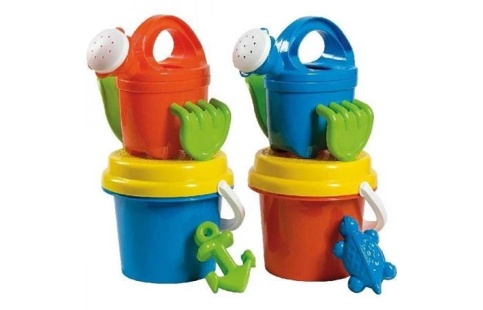 Emmersetje met gieter, harkje, schepje, zandvormpje, vergiet en emmertje met diameter van 11 cm. 2 assorti kleuren.Â