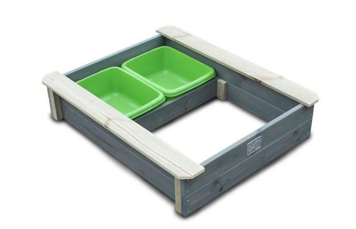 De EXIT Aksent houten zandbak is een compacte vierkante zandbak met deksel. De zandbak is voorzien van twee groene bakken die je in de zomer kunt vullen met water voor de nodige waterpret. Speel vanaf de bankjes aan de zijkant met zand en water, ontdek hoe modder gemaakt wordt en beleef urenlang speelplezier. De groene bakken zijn uitneembaar en dus eenvoudig te legen en schoon te maken. Ben je klaar met spelen? Dan berg je het speelgoed op in de bakken en sluit je de zandbak met de deksel af, zodat het zand en speelgoed schoon blijft.