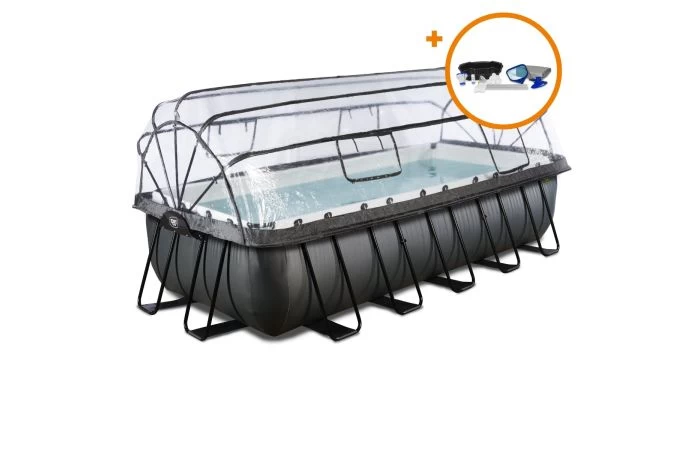 Het EXIT Black Leather zwembad 540 x 250 x 122 cm is een rechthoekig frame zwembad met een zwarte leren print en overkapping. Dit grote zwembad is standaard voorzien van een zandfilterpomp en een zwembadtrap. Daarnaast wordt dit zwembad geleverd met een uitgebreide accessoire set, waarmee je het zwembad in een handomdraai klaarmaakt voor gebruik én eenvoudig in perfecte staat houdt. Robuust, extra diep en van alle gemakken voorzien: beleef zomers lang zwemplezier met het hoogwaardige frame zwembad van EXIT Toys!