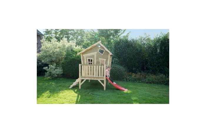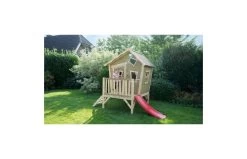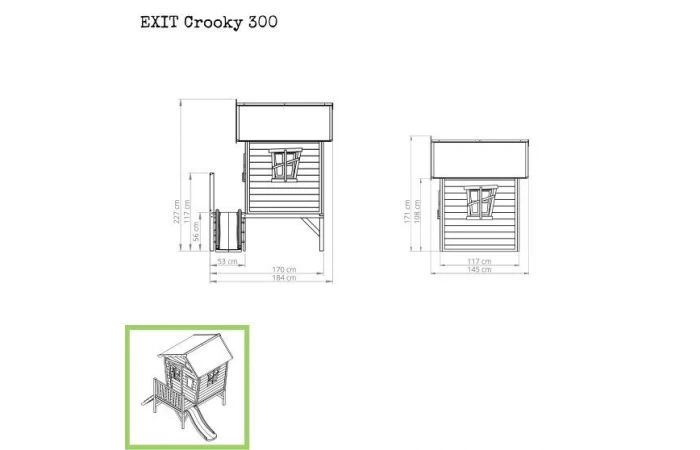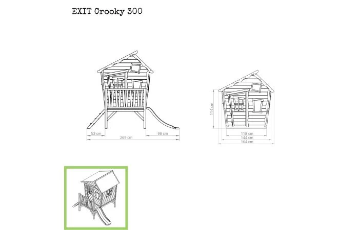 Een geweldige plek om te spelen, samen met je broertje of zusje, vriendje of vriendinnetje. Met zijn natuurlijke kleurencombinatie, asymmetrische ramen en deur lijkt dit speelhuisje op een echt zelf gebouwde blokhut! En met het krijtbord op de voorzijde van de EXIT Crooky is jouw stoere boomhut helemaal af! Het verhoogde huisje heeft een echte veranda en via het glijbaantje glij je zo weer naar beneden!