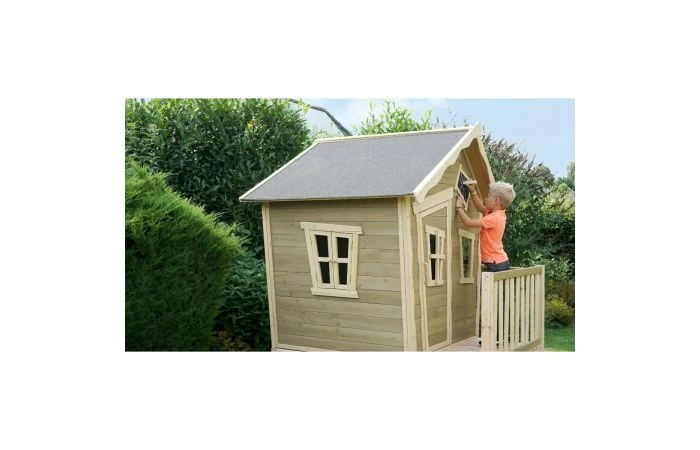 Duurzaam. De huisjes zijn gemaakt van gedroogd cederhout. Dit is een bijzondere houtsoort omdat het van nature bestand is tegen weersinvloeden en vocht en dus resistent is tegen houtrot. Het cederhout is dus niet behandeld met ongezonde chemicaliën, zoals dat bij grenen of vuren wel vaak het geval is. Cederhout is dus goed voor het milieu en veilig voor de kinderen. De panelen zijn reeds geverfd met een watergedragen beits. Tevens is de EXIT Crooky voorzien van een betumen dak waardoor het waterdicht is.