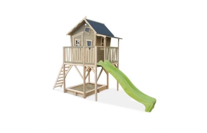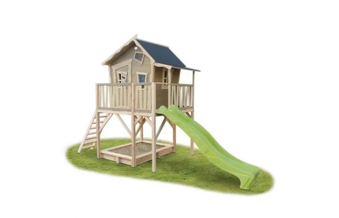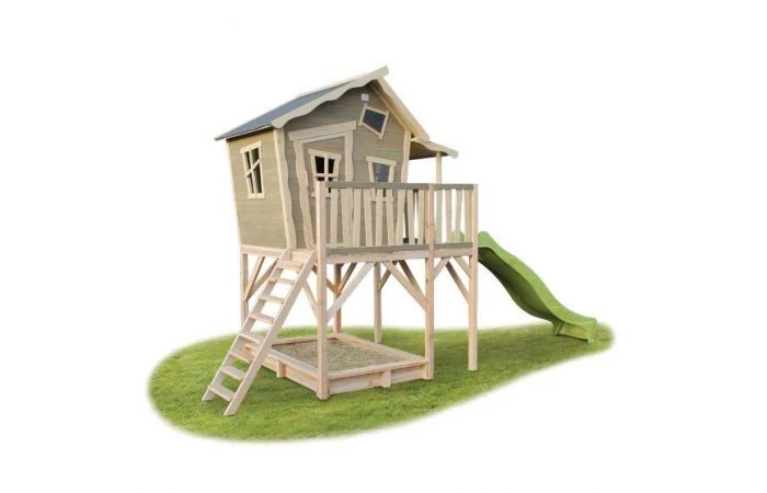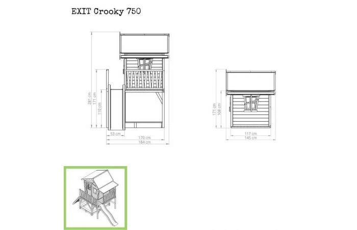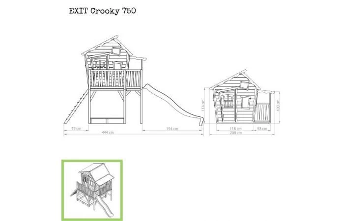Kies dan voor de EXIT Crooky 750; dit is werkelijk een prachtig en super stoer speelhuisje in XXL uitvoering! Een geweldige plek om te spelen, samen met je broertje of zusje, vriendje of vriendinnetje. Met zijn natuurlijke kleurencombinatie, asymmetrische ramen en deur lijkt dit speelhuisje op een echt zelf gebouwde boomhut! Het verhoogde huisje heeft een echte veranda ( 1.20 m hoog), die zowel links als rechts gemonteerd kan worden en waar kids lekker door kunnen blijven spelen, in de schaduw en zelfs als het regent! Via de hoge glijbaan glij je zo weer naar beneden! De binnenafmetingen van de EXIT Crooky lopen uiteen van 110,5 bij 110,5 cm op de grond tot maar liefst 138 bij 110,5 cm op het breedste punt waardoor het een lekker ruim huisje is waar je heerlijk met meerdere kinderen in kan spelen. De jongsten hebben lekker veel ruimte om in de zandbak te spelen terwijl de oudere kinderen boven op de ruime veranda of in het huisje spelen! En met het krijtbord op de voorzijde van de EXIT Crooky is jouw stoere boomhut helemaal af! Â