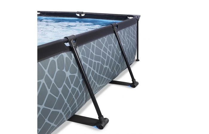 Ontdek hoe stevig een rechthoekig opzetzwembad kan zijn: het gepoedercoate stalen frame en de sterke hoekpunten van het EXIT Stone zwembad zorgen ervoor dat het bad altijd stabiel staat en jarenlang meegaat. De meegeleverde filterpomp houdt het water schoon en in beweging zodat vervuiling van het water wordt tegengegaan. In het EXIT Stone zwembad neem je altijd een frisse duik!