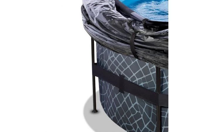 Ontdek hoe stevig een rond opzetzwembad kan zijn: het gepoedercoate stalen frame en de sterke poten van het EXIT Stone zwembad zorgen ervoor dat het bad altijd stabiel staat en jarenlang meegaat. En het meegeleverde watercirculatiesysteem maakt dit zwembad helemaal af. De hoogwaardige zandfilterpomp reinigt de kleinste deeltjes uit het zwembad door het water krachtig door het filterbed heen te pompen. Dit zorgt ervoor dat vuil, zoals zand, ongedierte of algen achterblijven in het filter. In het EXIT zwembad neem je altijd een frisse duik!
