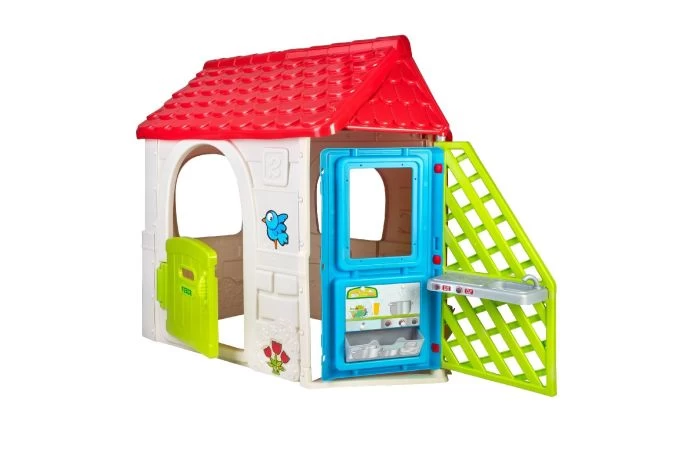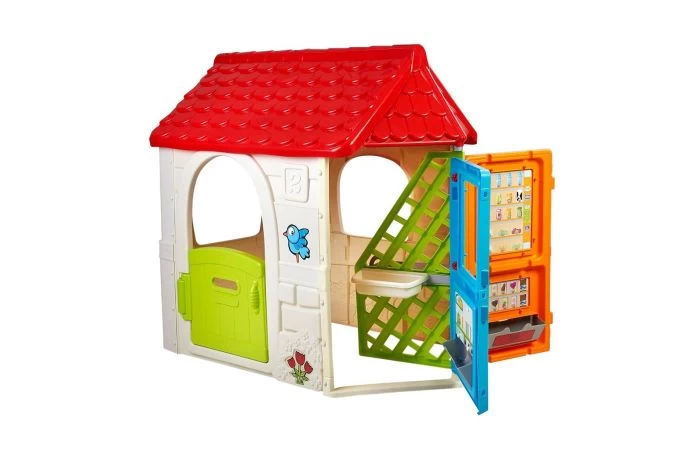 Feber Gyro huis is een speelhuis inclusief draaideur, met 6 verschillende speelplekken: keuken, barbecue (inclusief gootsteen), tuin (met plantenbak), automaat, school (met whiteboard) en supermarkt. Stevig, eenvoudig te monteren en met anti-UV systeem (voor minder kleurverlies en betere weerstand). Kleuren: rood, zand, groen, blauw en oranje. Productafmetingen: 85 x 166 x 124 cm. Voor kinderen vanaf 2 jaar.