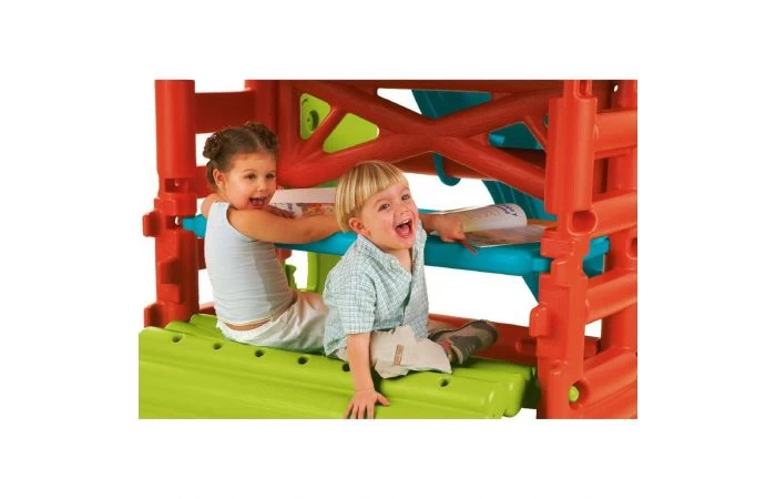 Aan het Wood House van Feber zitten ladders aan twee kanten om op het platform te klimmen en daarna van de aparte slalom glijbaan te glijden. Met een kantelbare bank om aan de tafel te spelen of om op te zitten. Het blad kan worden omgekeerd en als zandspeelbak gebruikt worden. Gereedschap is niet nodig.
