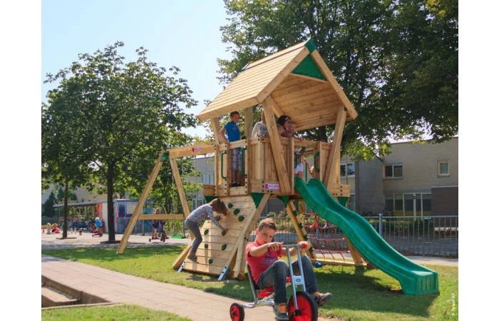 Gecertificeerd voor commercieel gebruik, het ideale houten speelhuis met schommelaanbouw voor scholen, een kleine kinderopvang of vakantiepark.