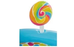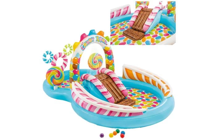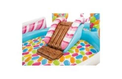 Intex Candy Zone Play Center. Een prachtig vormgegeven kinderzwembad in snoep-thema! Uren plezier op het Candy Center met glijbaan en rolbaan voor de balletjes! Sproeier en waterval kunnen worden aangesloten op de tuinslang. Er worden 6 ballen en 2 lolli pops meegeleverd. Heeft een zachte landingsmat in hetbad voor zachte landingen tijdens het glijden. Met leegloopventiel onder in het bad. Inclusief reparatiesetje. Afmetingen: 295 x 191 x 130 cm, wandhoogte 14 cm.Capaciteit water: 206 liter. Verpakt in fraaie full colour box. Geschikt voor kinderen vanaf 3 jaar.