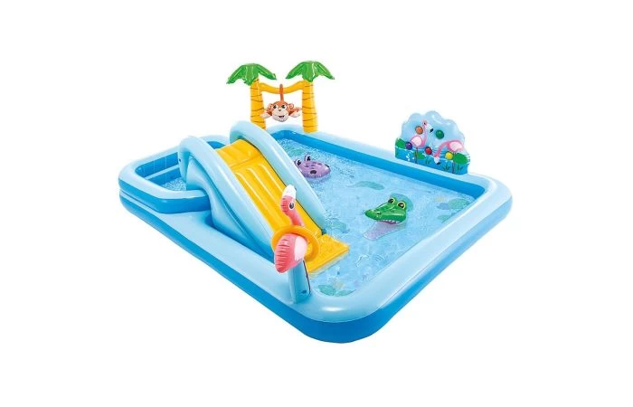 Dit speelcentrum van Intex is een echt speelparadijs! Klim omhoog door de lianen en glij van de glijbaan zo het water in. Boven de glijbaan zit een waterval, net als in een echte jungle! Palmbomen, een aap die omhoog klimt en dan ook nog een giraffe met een ring tussen zijn tanden. Kun jij alle ballen raak gooien? Dit zwembad speelcentrum Jungle heeft een afmeting van 216 x 188 x 124 cm. Door de tuinslang op het speelcentrum aan te sluiten komt er water uit de waterval boven de glijbaan. Wordt geleverd met 6 speelballen, voor een spelletje met de giraffe. Onderaan de glijbaan zit een zachte mat, voor extra veilige landing. Het zwembad kan met 15 cm water gevuld worden, er past dan 220 liter in. Met afvoerplug, waardoor het water na gebruik makkelijk weg kan lopen. Het materiaal van het speelzwembad is vinyl, van een hoge kwaliteit. Ook wordt een reparatievel meegeleverd. Wanneer er toch een lekje ontstaat dan is het hiermee makkelijk geplakt.