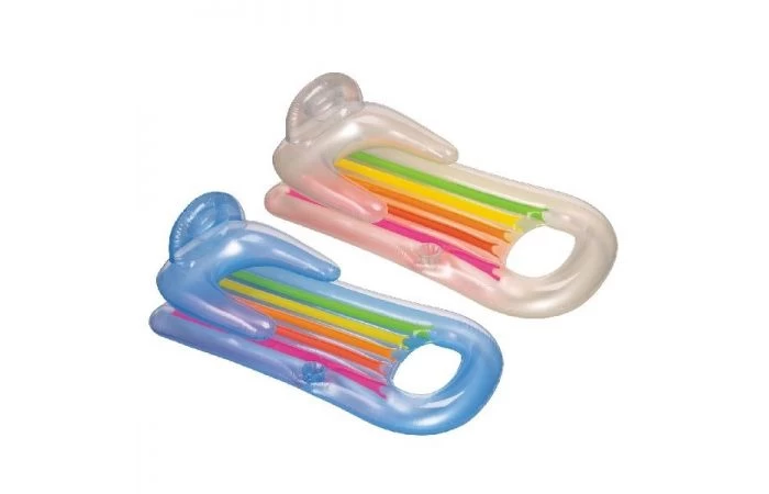 Lounge luchtbed, met een afmeting van 160 x 85 cm: vervaardigd van vinyl, met 2 luchtkamers en bekerhouder. Een heerlijk luchtbed om urenlang mee in het water te liggen! Twee assorti in blauw of transparant met felle kleuren. Inclusief reparatiesetje.