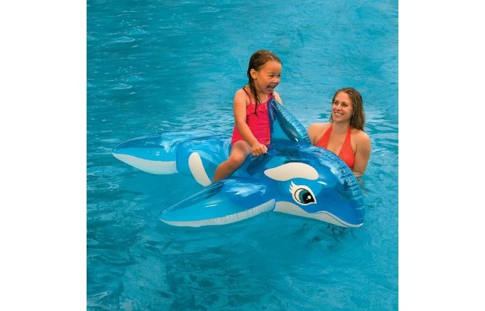 Intex Walvis Ride On, fraaie lichtblauwe walvis met 2 handvaten om je goed vast te kunnen houden. Inclusief reparatievel. Afmetingen: 152 x 114 cm. Wordt geleverd in fraaie doos. Geschikt voor kinderen vanaf 3 jaar.