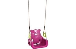 De T-bar wordt geleverd met 3 bevestigingspunten, voor extra veiligheid. Het turquoise babyzitje heeft een geel PP-touw met turquoise lassen, terwijl de andere kleuren natuurlijk gekleurd touw met zwarte PP-lassen hebben.