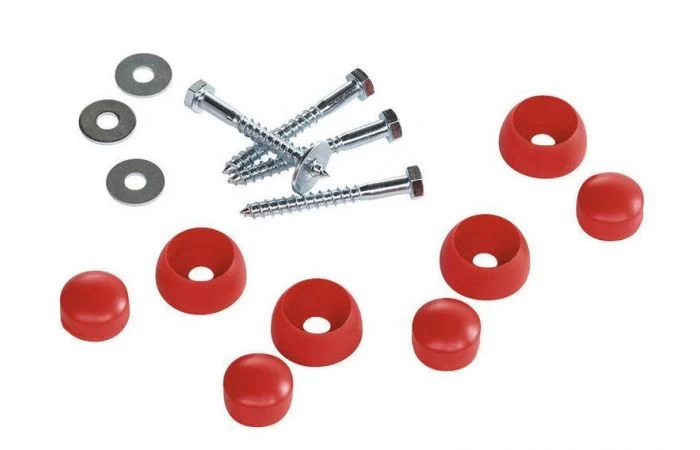 Bevestigingset voor duikelstang – schroeven, ringen en afdekdoppen – rood