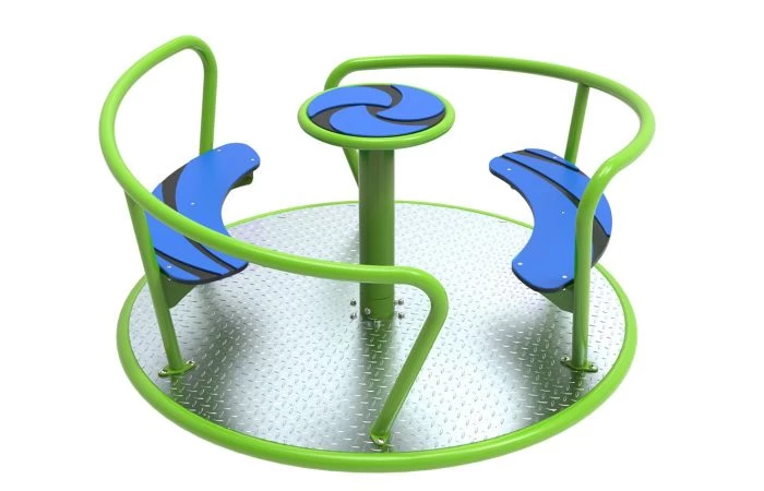 Het draaimechanisme is tevens voorzien van hoogkwalitatieve en onderhoudsvrije rollagers. Het centrale handwiel laat de kinderen toe om al zittend de carrousel zelf te laten draaien op een veilige manier.