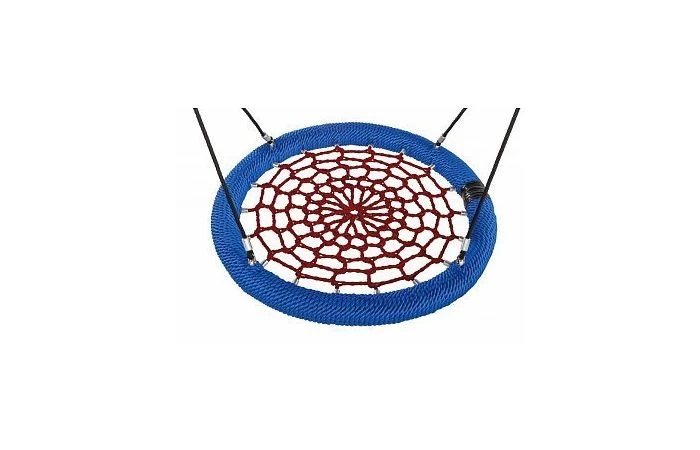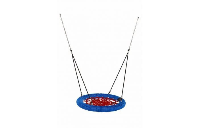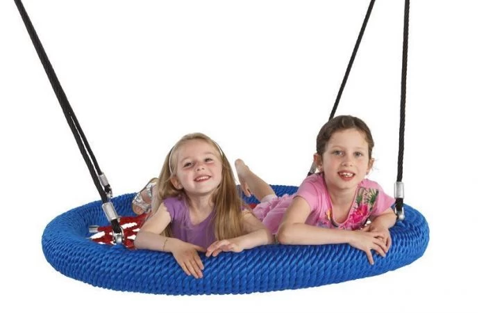 De nestschommel ‘rosette’ van KBT is een gloednieuw en extrastevig ontwerp. Hij is verkrijgbaar in de maten Ø 1000 mm en Ø 1200 mm. De ophangtouwen zijn vervaardigd in gewapend touw met een roestvrij stalen ketting (Ø 6 mm) aan het bovenuiteinde om de ophanglengte aan te passen. De sluitingen zijn vervaardigd in kwaliteitsvol roestvrij staal. Alle bevestigingshulzen zijn vervaardigd in aluminium.