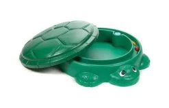 Stevige Turtle zandbak in donkergroene kleurstelling. Met de deksel erop, blijft het zand goed schoon en er past 70 kg zand in de zandbak. Met brede rand, waarop meerdere kinderen comfortabel kunnen zitten.