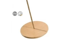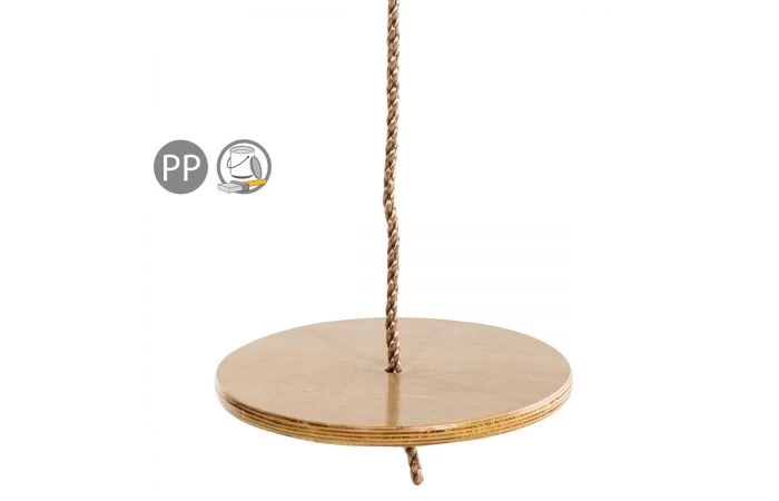 Deze schommel bestaat uit een multiplexschotel van Ø30 cm en is beschermd met een laag vernis die de natuurlijke houtkleur van het multiplex tot haar recht doet komen.