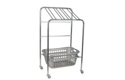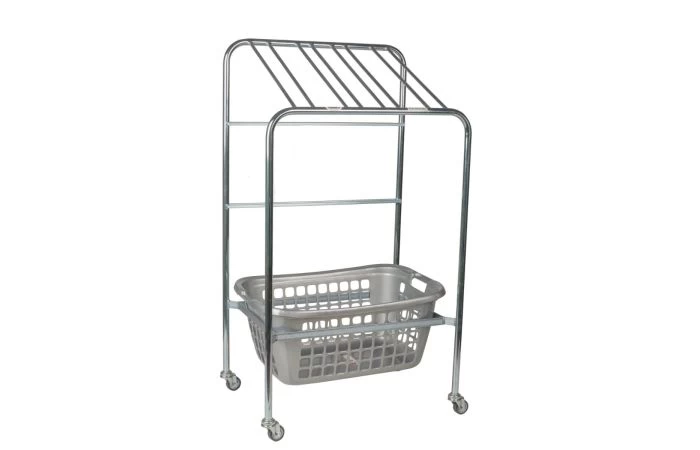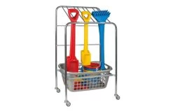 Het scheppenrek is vervaardigd van gegalvaniseerd buismateriaal met 4 zware zwenkwielen. Onderin past de op de afbeelding getoonde plastic opbergmand.Â