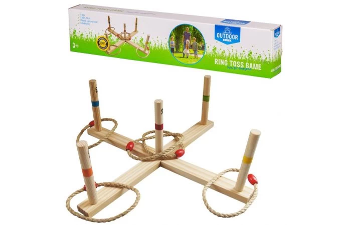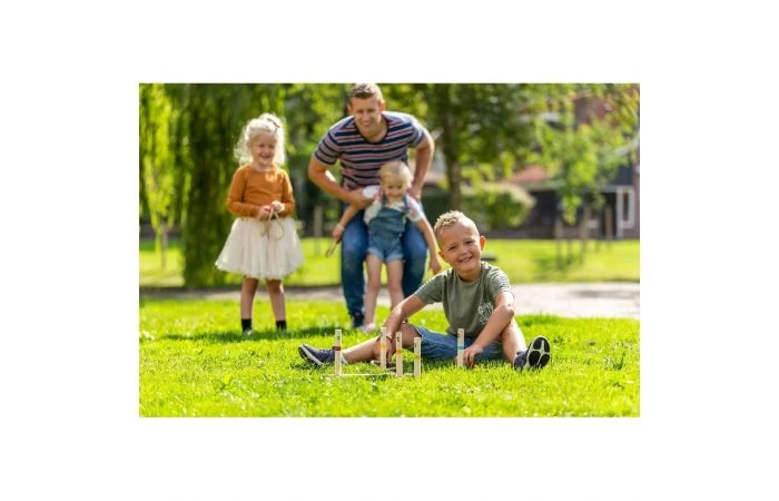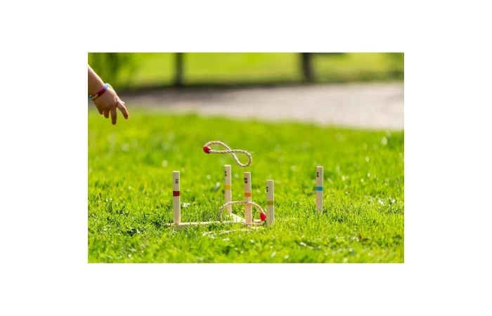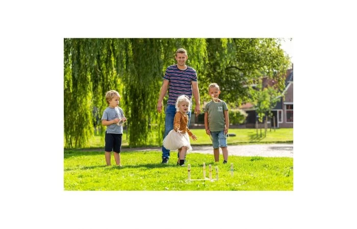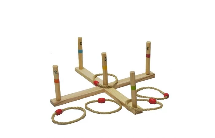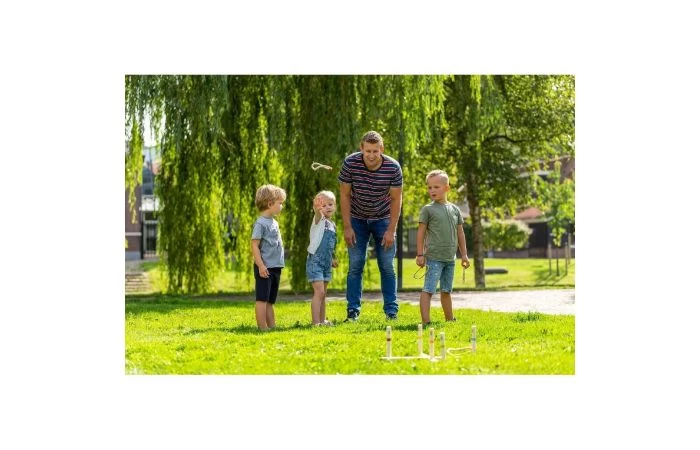 - Inhoud: 5 ringen touw en 5 palen van 15 cm hoog.Â