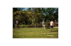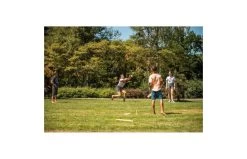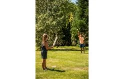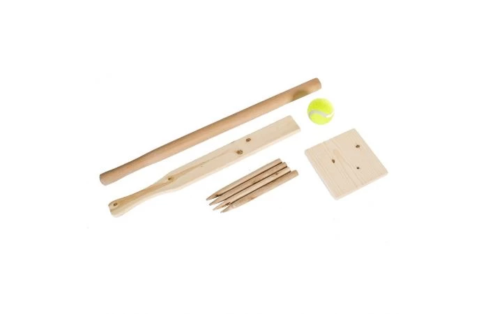 - Deze set bestaat uit een houten knuppel (59,5 x 3 cm), een houten slagbal plankje (48,5 x 5,2 x 1,3 cm), 4 houten pennen die als honken dienen, 1 houten thuisplaat en een 1 tennisbal.
