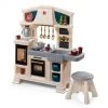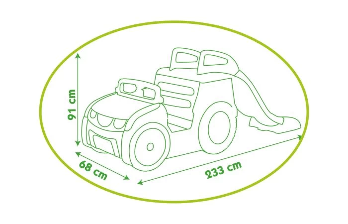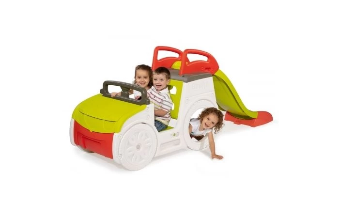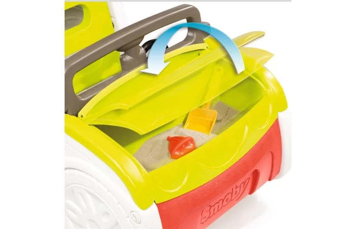 Net als in een echte auto kunnen in deze Adventure Auto van Smoby twee personen naast elkaar zitten. De kinderen kunnen de motor fictief starten door de sleutel om te draaien en met de elektronische hoorn kunnen zij ook claxonneren. Toet toet toet! De auto bevat een glijbaan aan de achterkant en een zandbak in de motorkap. Haal de wieldop uit de wielen en kruip door de doorgang.
