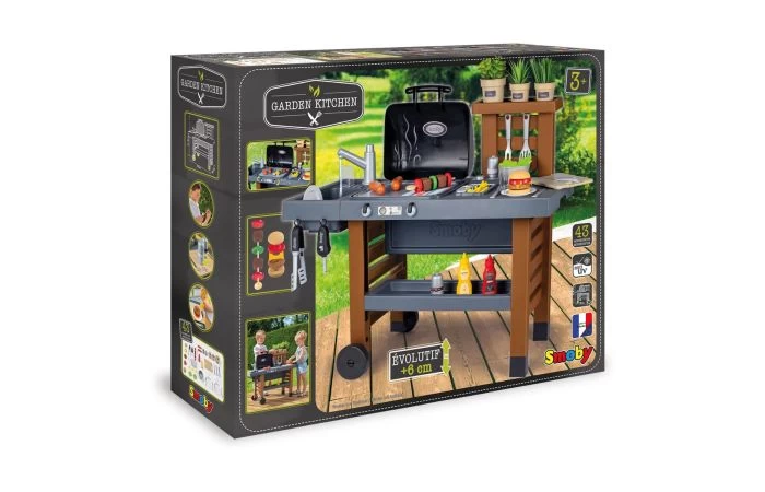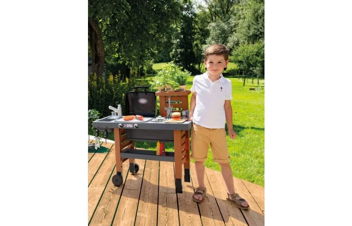 Deze outdoor Tuinkeuken van Smoby is perfect om kinderen deze zomer urenlang bezig te houden! Met zijn bakplaat, barbecue, friteuse en accessoires kunnen ze volwassenen nadoen en heel wat feestelijke maaltijden bereiden terwijl jij geniet van het zomerse weer. Dankzij de twee wielen kan je deze keuken ook gemakkelijk verplaatsen. De barbecueknoppen maken geluid voor een realistischer effect. En de gootsteen werkt via een waterpompsysteem om af te wassen na het eten!