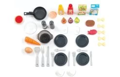 Deze Smoby keuken wordt geleverd met veel accessoires zoals 2 borden, bestek, 2 glazen, een snijplank, sausjes, slablaadjes, frietjes, worstjes, potjes om echte kruiden in te planten, een vuurstarter, etc.