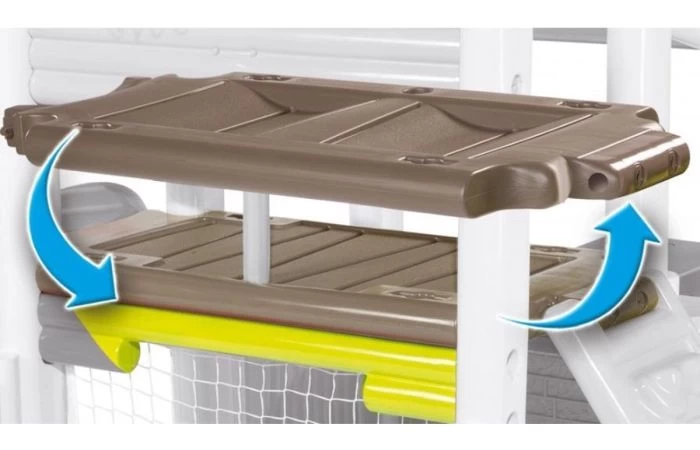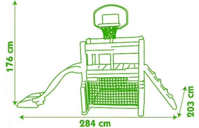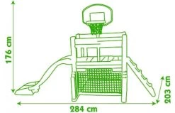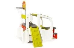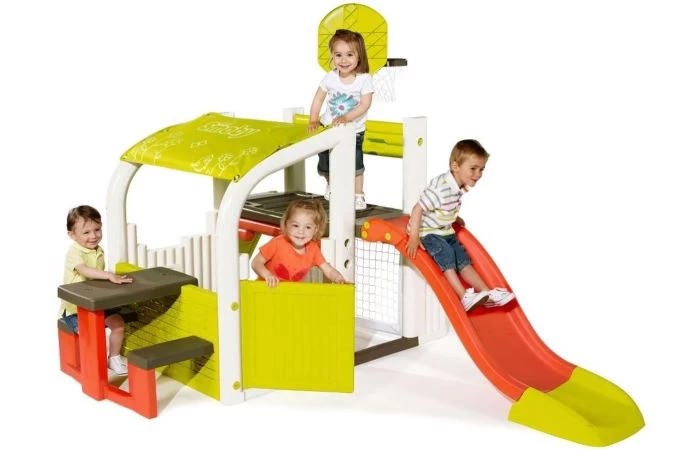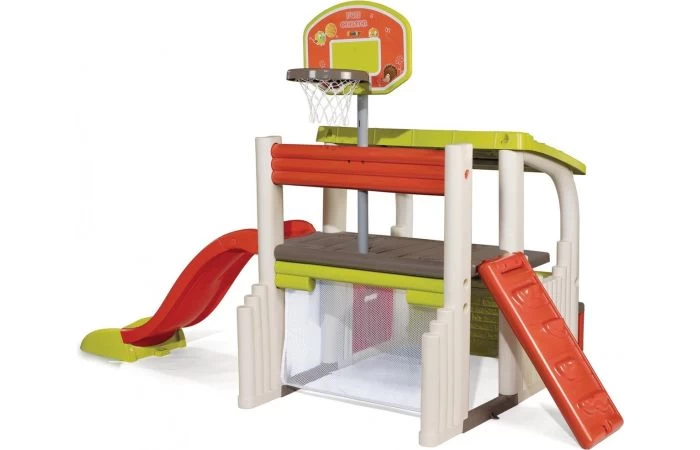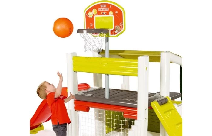 Het Smoby Fun Center speeltoestel is het meest veelzijdige speeltoestel van Smoby. Dit speelhuisje beschikt over een basketbalkorf, voetbaldoeltje, maar ook een zitgedeelte en overdekt gedeelte. Multisportactiviteitencentrum voor kinderen vanaf 2 jaar. Uitgerust met 2 ruimtes: – huisgedeelte met een dak, 1 poort en een picknickplaats met 1 tafel en 2 banken. – multisportterrein voorzien van: 1 glijbaan van 1.50m, 1 mandje basketbal, 1 voetbalkooi en 1 omkeerbare muur (ladder of klimmen). De structuur is van geblazen plastic gemaakt voor meer stevigheid en stabiliteit. De kunststof delen zijn anti-UV behandeld voor een goede weerstand en betere kleurechtheid.Â
