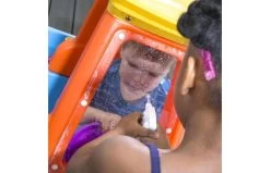 De kinderen horen het water in de “gastank”, het piepen van de ruitenwisser tegen de voorruit en het vallen van de regen als het water in het doolhof stroomt, waardoor er verschillende prikkelingen voor de zintuigen worden toegevoegd aan de speelervaring met het wateractiviteitencentrum.