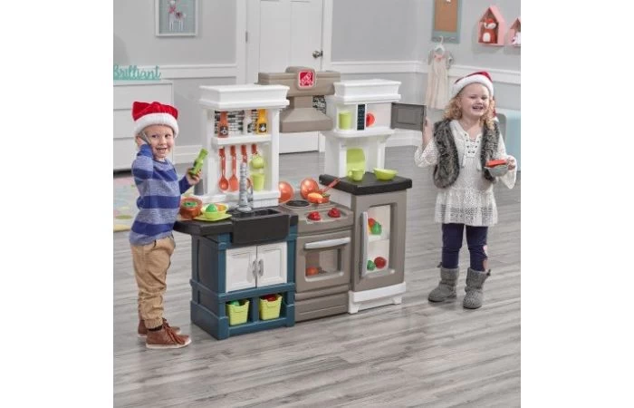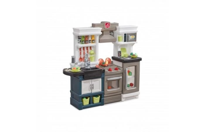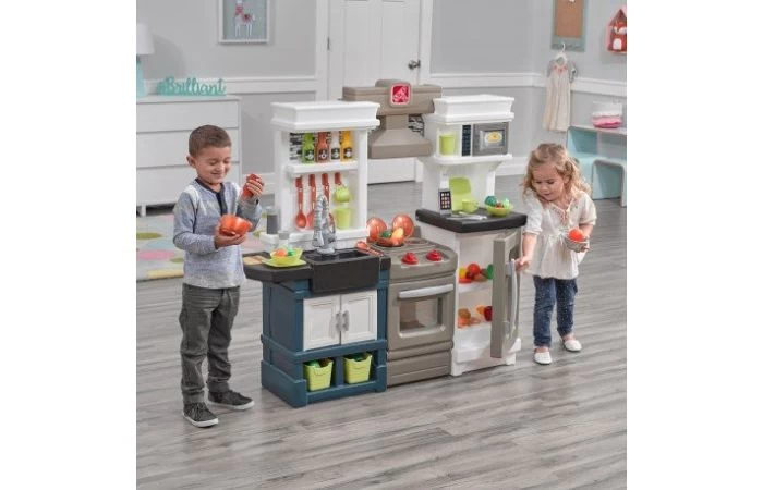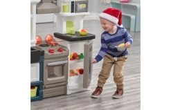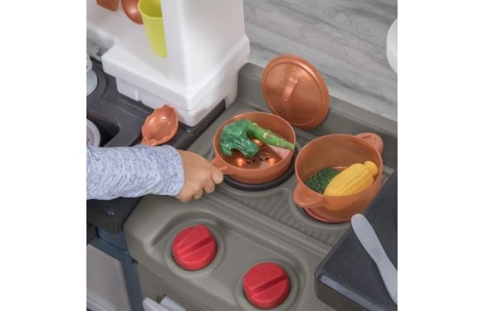 Junior-chefs kunnen hun gerecht in het oog houden terwijl ze naar het volgende ingrediënt zoeken in de koelkast en oven met doorkijkvensters. Kleintjes kunnen de afwas doen na het eten van hun favoriete maaltijd in de grote boerderijstijl gootsteen. Wanneer de afwas gedaan is en de speeltijd voorbij is, ruim vlug op door alle kookaccessoires in de onderste kasten op te bergen.