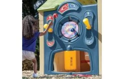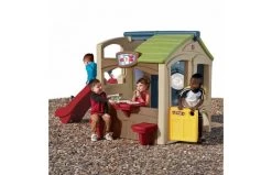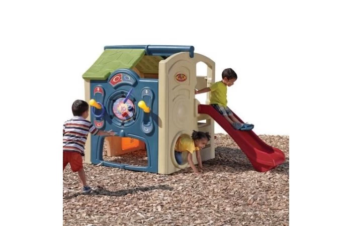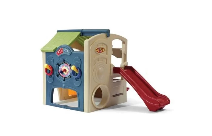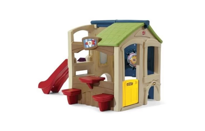 Activiteitenmuur bevat haak en lus bal doel en ring worp om hand-oog coördinatie te verbeteren. Een grote 4 ft. (1,2 meter) lange dia bevordert actief spel Snacktafel met ingebouwd aanrecht en twee stoelen Twee leuke ingangen zijn onder andere een Nederlandse deur en kruipen door de portal Inclusief twee ballen, twee rode en twee blauwe ringen Bestemd voor familie- en huishoudelijk gebruik binnenshuis, alleen voor een goede ondergrond Meer informatie over de binnenafmetingen van elk speelhuis Volwassen montage vereist.