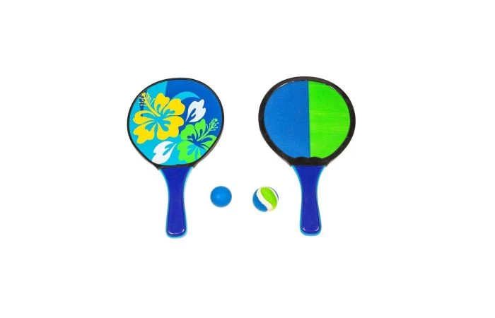 Summertime Catch and Hit set: met de ene kant kun je beachballen en met de andere kant een kleefspel spelen! Lengte van het racket: 38 cm. Dikte: 8 mm. Met felgeleurd bloemdessin. Wordt inclusief tennisbal (diameter 4,5 cm) en pvc bal (diameter 4 cm) geleverd in net. Geschikt voor kinderen vanaf 5 jaar.