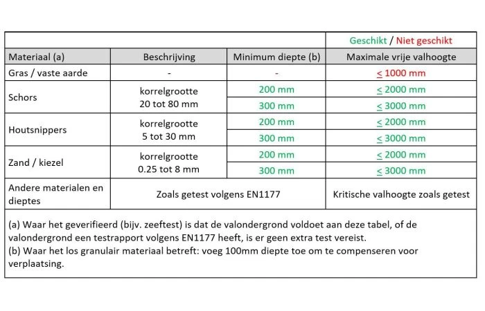 - In Nederland/België wordt gras gedoogd voor vrije valhoogten tot 150cm. Dit is mede afhankelijk van het klimaat, de bodemgesteldheid en onderhoud. De beheerder is ten alle tijde zelf verantwoordelijk voor de kwaliteit van het gras/ondergrond.
